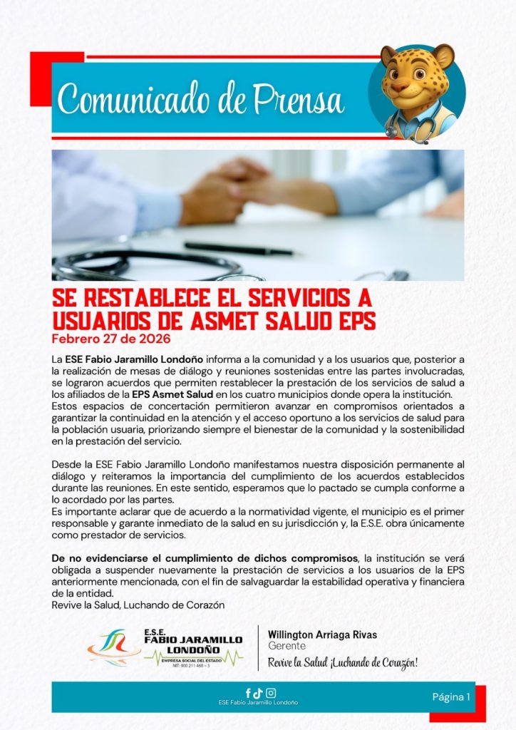 Se restablecen los servicios de salud para los usuarios de Asmet Salud EPS en los municipios donde opera la E.S.E. Fabio Jaramillo Londoño.