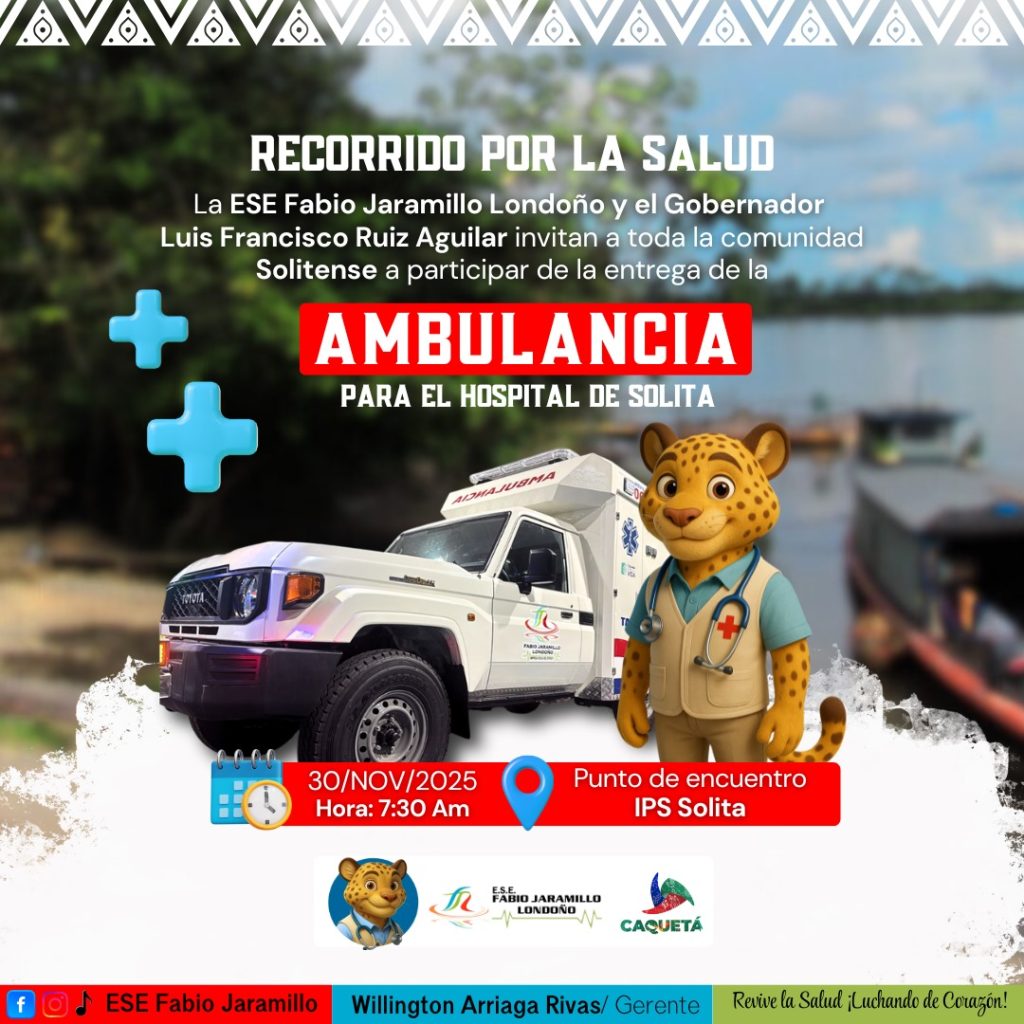 Este 𝐝𝐨𝐦𝐢𝐧𝐠𝐨 𝟑𝟎 𝐝𝐞 𝐧𝐨𝐯𝐢𝐞𝐦𝐛𝐫𝐞, la ESE Fabio Jaramillo Londoño y el Gobernador Luis Francisco Ruiz Aguilar invitan a toda la comunidad solitense a acompañar la 𝐞𝐧𝐭𝐫𝐞𝐠𝐚 𝐨𝐟𝐢𝐜𝐢𝐚𝐥 𝐝𝐞 𝐥𝐚 𝐧𝐮𝐞𝐯𝐚 𝐚𝐦𝐛𝐮𝐥𝐚𝐧𝐜𝐢𝐚 para el Hospital de Solita.