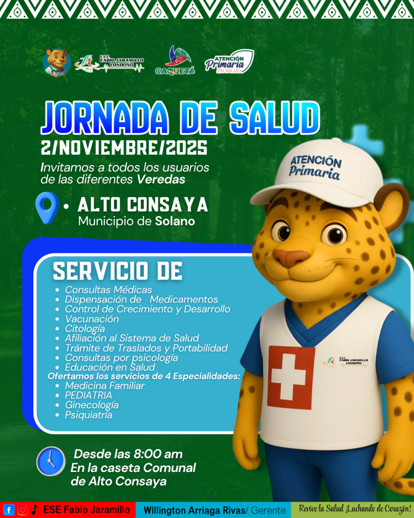 Este 2 de noviembre de 2025, el equipo de la ESE Fabio Jaramillo Londoño estará en Alto Consaya, municipio de Solano, con una gran Jornada de Salud 🩺🌿