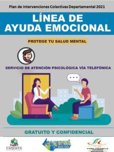 Se informa a la comunidad que el servicio de la Línea de Ayuda Emocional en Salud Mental ha culminado. Servicio que se presto bajo actividad del Plan de Intervenciones Colectivas Departamental 2021 durante los meses de Julio, Agosto y Septiembre en el horario de lunes a viernes de 8:00 am a 12:00 pm y de 2:00 pm a 6:00 pm en los municipios de Valparaíso, Solita y Solano. Cumpliendo con su objetivo de orientación, acompañamiento, información, remisión, referenciación y seguimiento de la comunidad atendida.