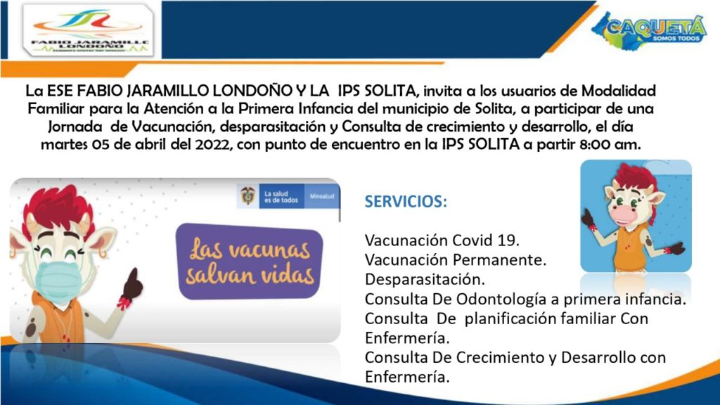 La E.S.E Fabio Jaramillo Londoño invita a jornada de vacunación, desparasitación y consulta de crecimiento y desarrollo en la IPS de SOLITA, CAQUETÁ.
