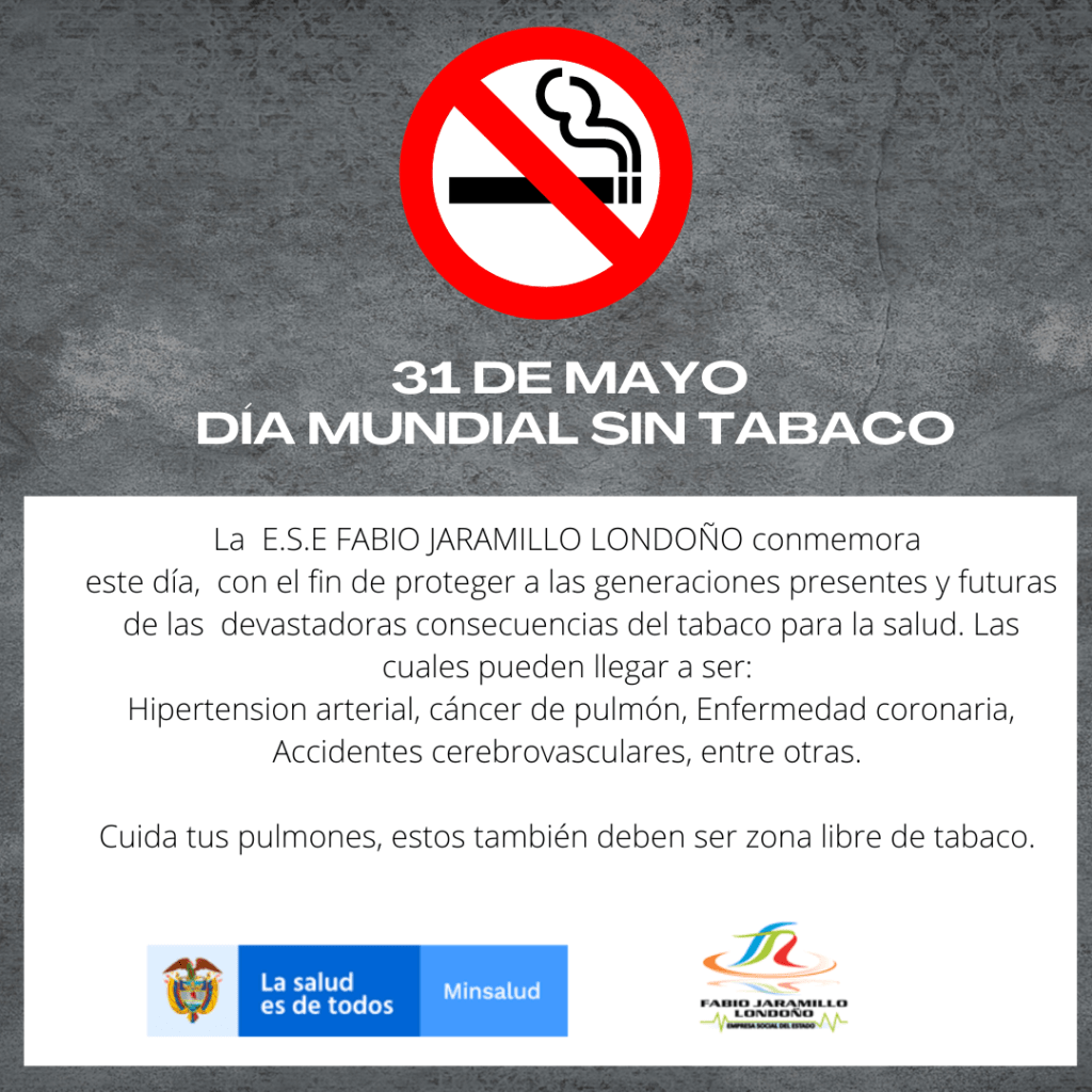 La E.S.E Fabio Jaramillo Londoño, invita a todos los usuarios del servicio de salud y población en general a tomar conciencia sobre el no consumo de tabaco, somos el ejemplo de los niños, No mas cenizas, No mas tabaco.