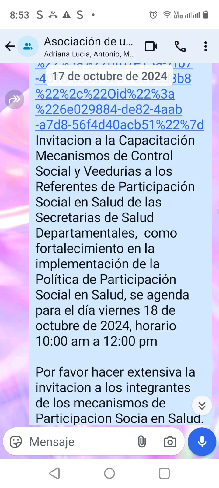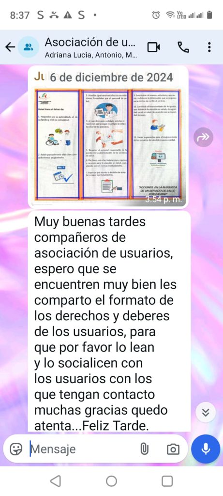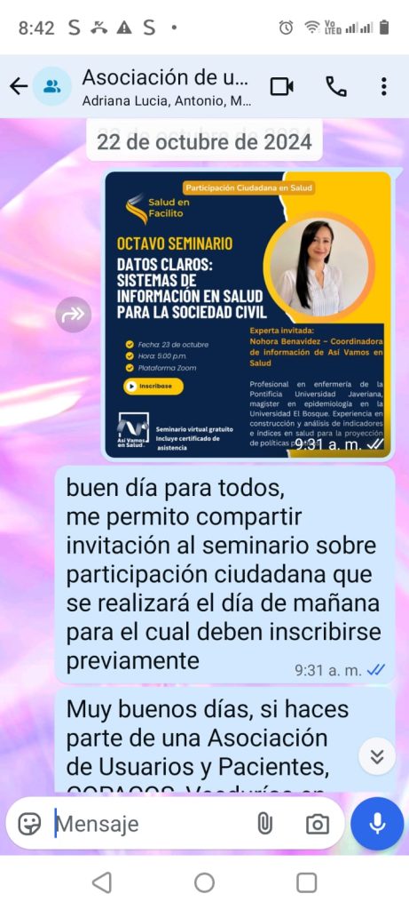 ACTIVIDAD: Invitación a través del WhatsApp a la asociación de usuarios de la IPS Solita a seminarios y actividades de capacitación en temáticas de participación social en salud